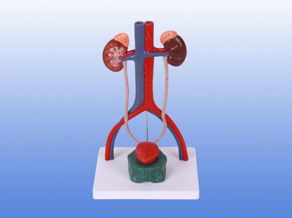 ■泌尿系统立体模型由肾、输尿管、膀胱、动脉和静脉组成,可拆分为3部件,展示了人体泌尿系统的基本结构器官和泌尿管路形态,其中膀胱可以拆分为2部件,有数字指示标识。