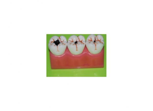 该模型由3个磨牙剖面6个部件组成,并显示磨牙的形态和构造以及龉齿病变发展过程等结构,共有10个部位指示标记。